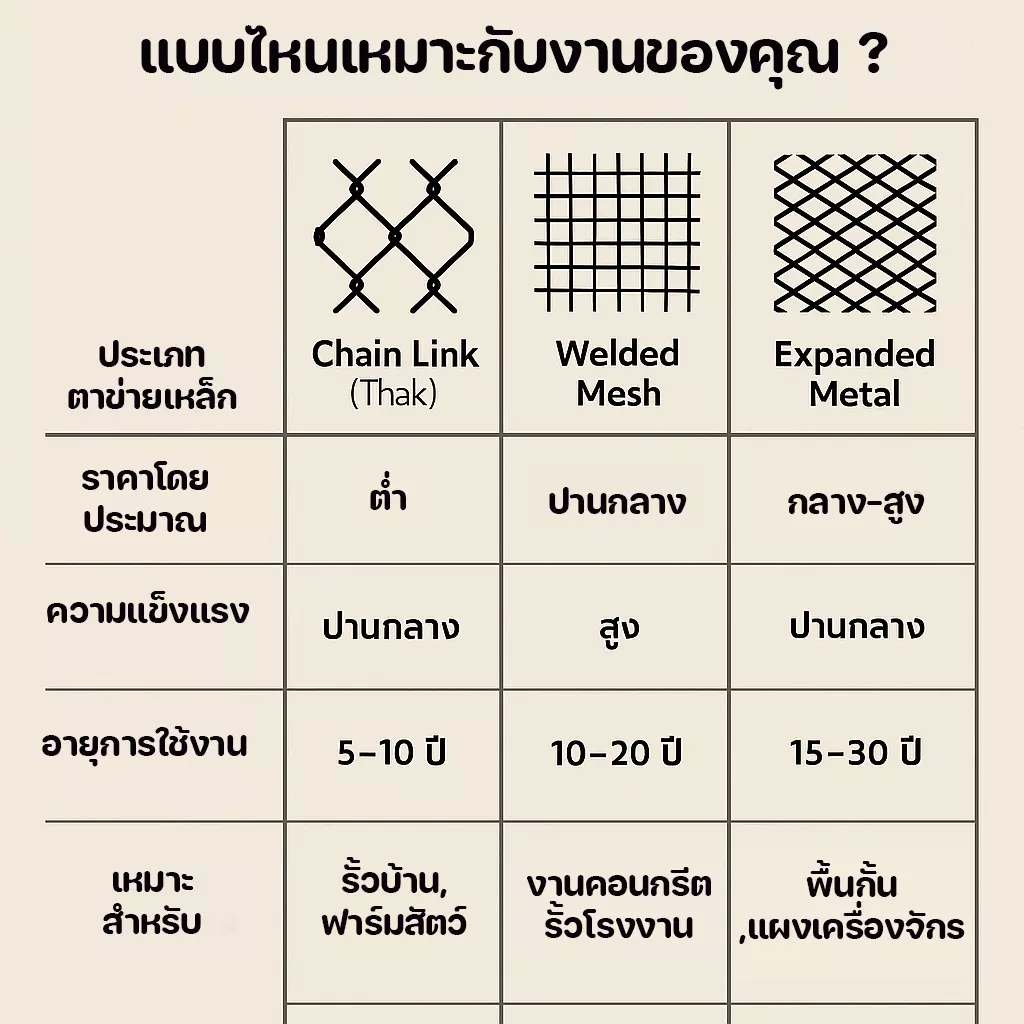 ตารางเปรียบเทียบตาข่ายเหล็กแต่ละชนิด